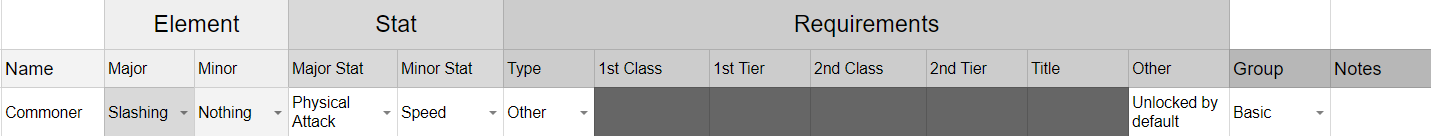 So, there’s a lot of information crammed in there, but I’ve tried to seperate each major section by color. You might have noticed I didn’t create a sheet for the skills. I’ve skipped them for now, as I want to focus on the classes in the beginning. Each of the input boxes with little arrows in them are actually drop down inputs, to make it easier for the designer (me) to quickly set each class value at a glance. I’ll be going over the creation of these in the next blog post, but this post is getting a bit long, so I’ll leave it there.