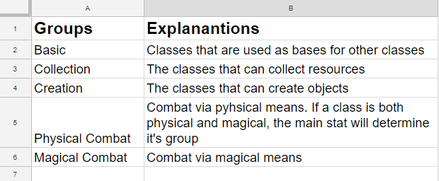 Each of these are in their own sub-sheet of the overall spreadsheet. Now that I have laid out the backend for all other mechanics, it’s time for the main attraction: the classes. This one is a LOT bigger than the others.