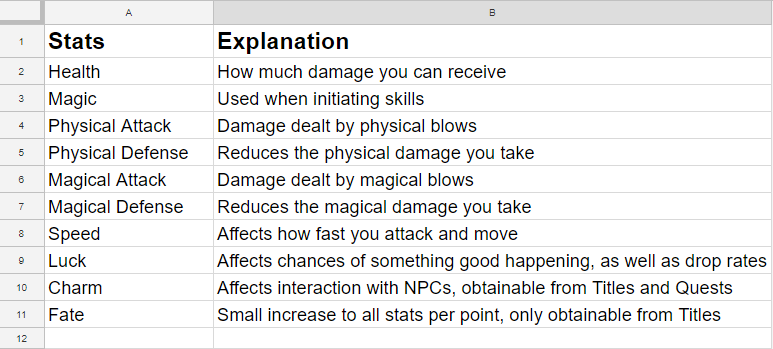 So, designing RPGs is kinda hard. They get even harder when you try and list out everything in plain text. I learnt this the hard way, trust me, it’s not fun. About halfway through said plain text listing, I decided that I needed a better way to do this. My solution? Google Sheets.