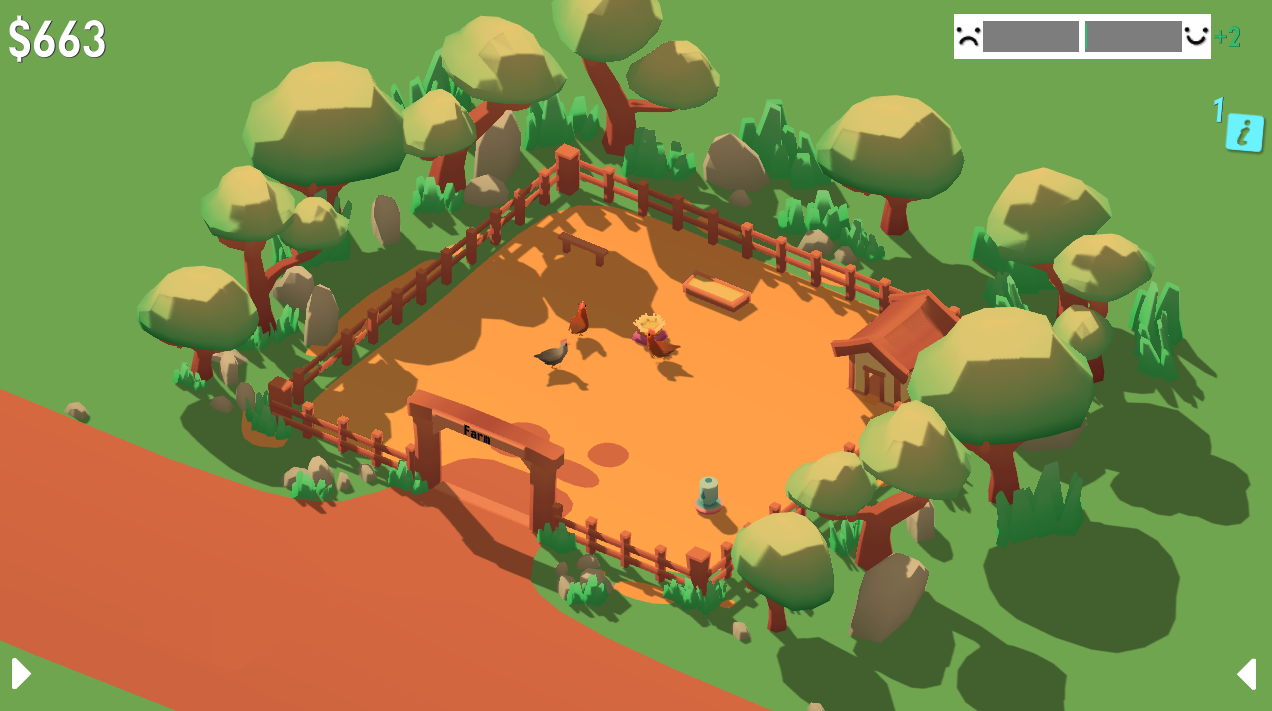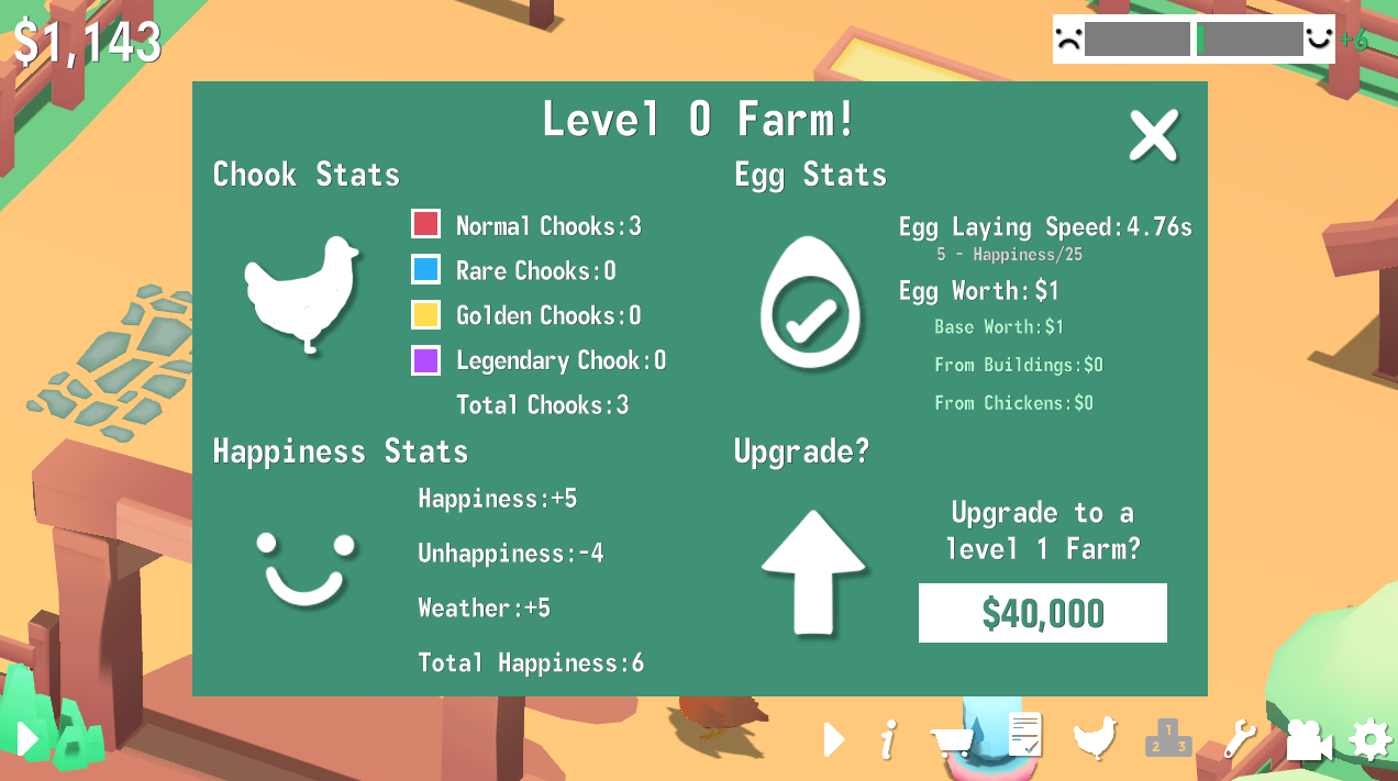 The first thing I designed and balanced was the core gameplay loop present in Cheeky Chooks. This loop was basically 'spend money to earn more money', with costs and money generation increasing exponentially as the player progressed. Players also had to maintain various resources such as food and water alongside their money. A big mechanic that influenced the loop was the Happiness mechanic. This mechanic was a core design feature in Cheeky Chooks as it rewarded players for making their chooks happy and penalized them heavily if their chooks were unhappy.