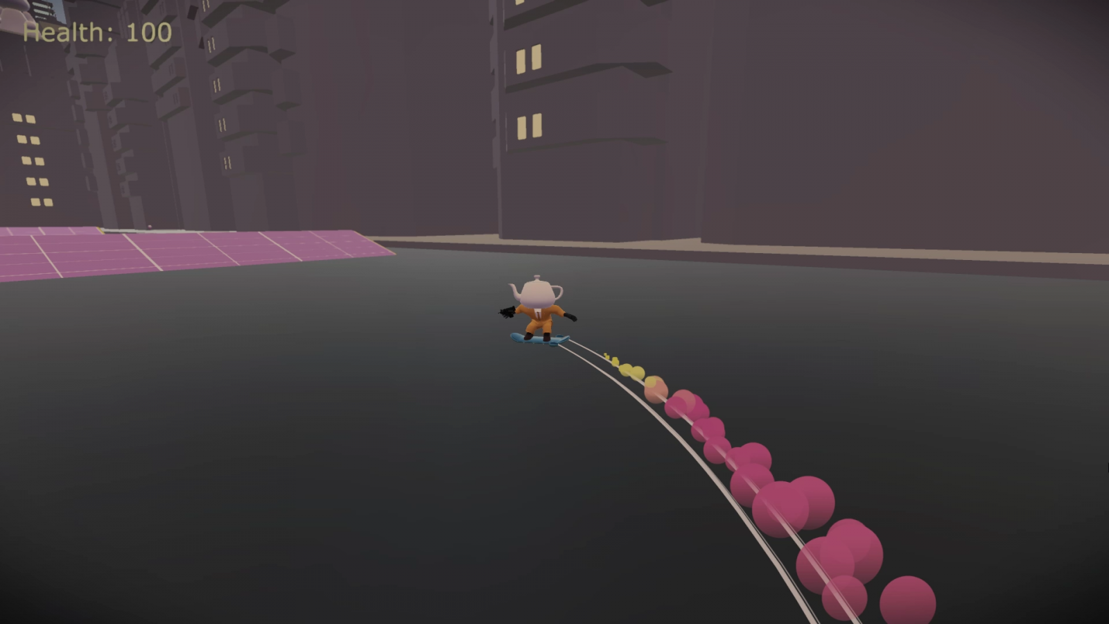 The hoverboard controller ended up allowing the player to boost, jump, double jump and perform tricks. The end product emulated the 'floatyness' of a hoverboard by simply giving the player zero friction. I also experimented with keeping the player off the ground completely by applying upwards force based on the distance between the board and the ground, to varying degrees of success.