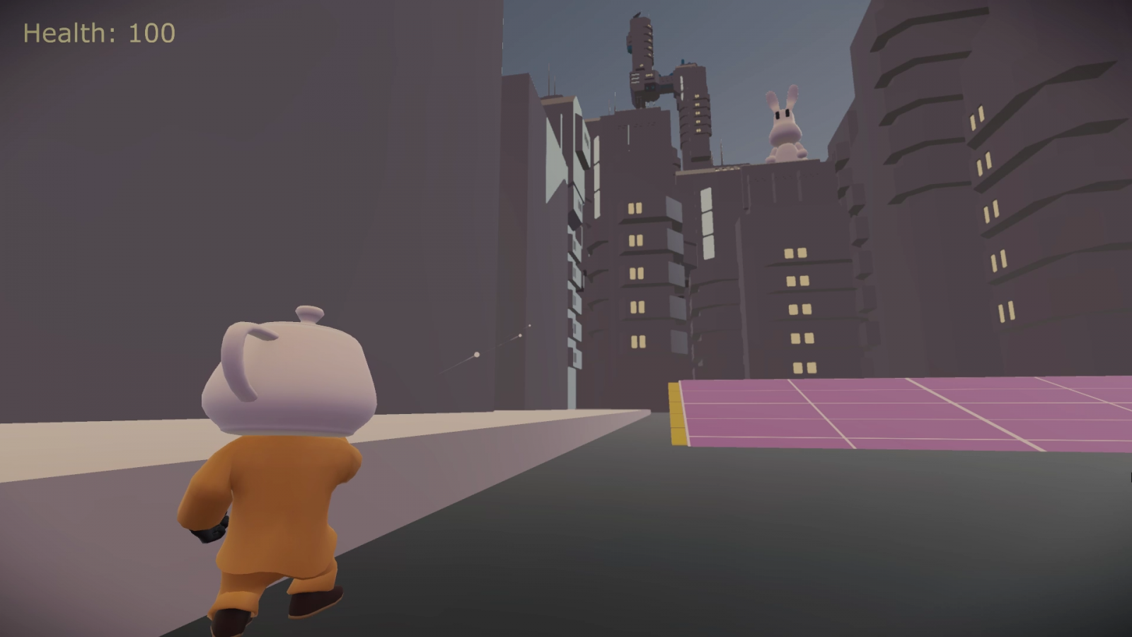 As an interesting gameplay hook, OTN also incorporated third person combat into it's gameplay loop. Firstly I implemented in-combat strafing that brought the camera down to a better angle to allow easier aiming and dodging. Then I implemented three weapons: the uzi, the rocket launcher and the chainsaws. Both the uzi and rocket launcher were ranged physics based weapons that shot physical projectiles. The chainsaw also used physics, but the actual attacks were registered by colliders on the chainsaws that were moved via animations